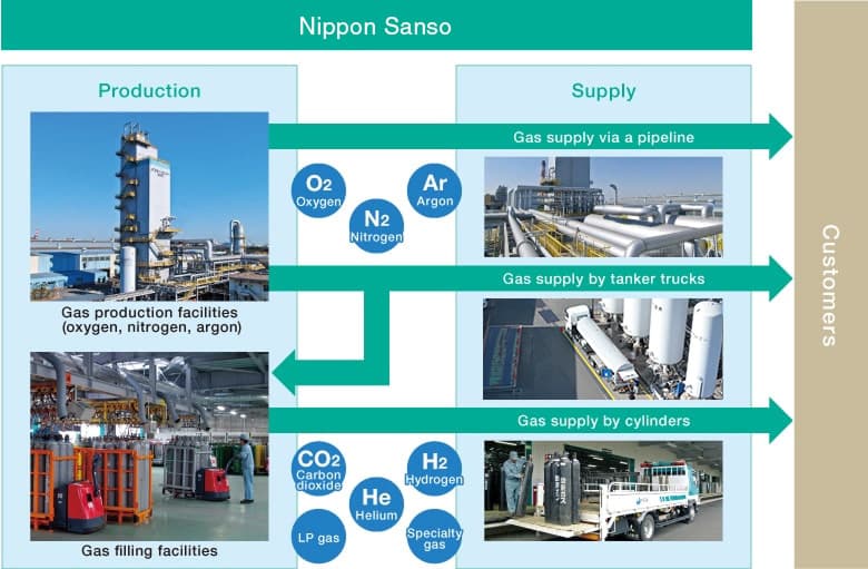 Nippon Sanso provides a stable supply of industrial gases to our customers via our nationwide production-supply network.