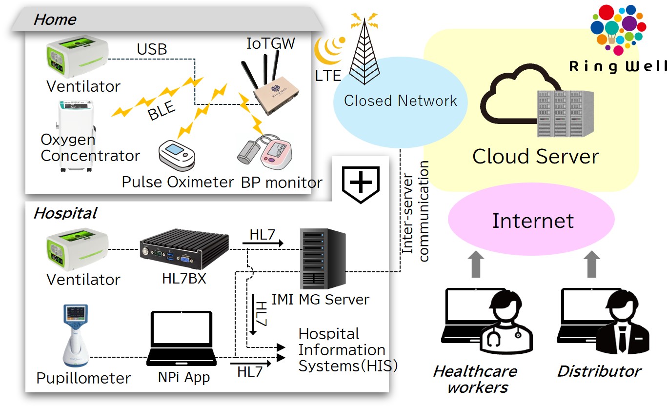 The home healthcare devices monitored remotely through RingWell include oxygen concentrators, pulse oximeters, blood pressure monitors, and ventilators supplied by IMI Co., Ltd. By installing a dedicated IoT gateway in the patient’s home alongside the relevant home healthcare devices, data can be collected from these devices via Bluetooth or USB communication. The collected data are stored on a cloud server via the Internet and can be viewed on the RingWell interface.