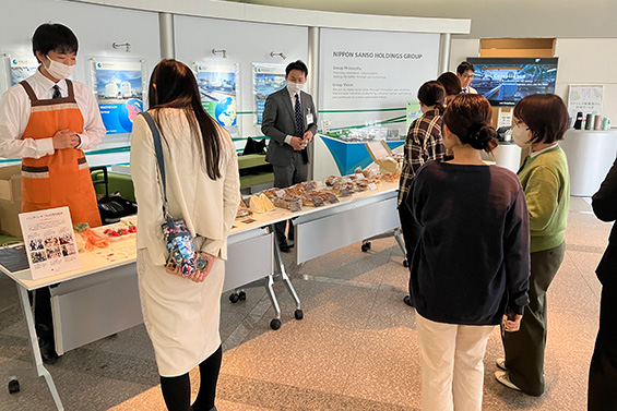 A sales event was held in the lobby of the Head Office. The event was crowded with many employees shopping for healthy and tasty foods.