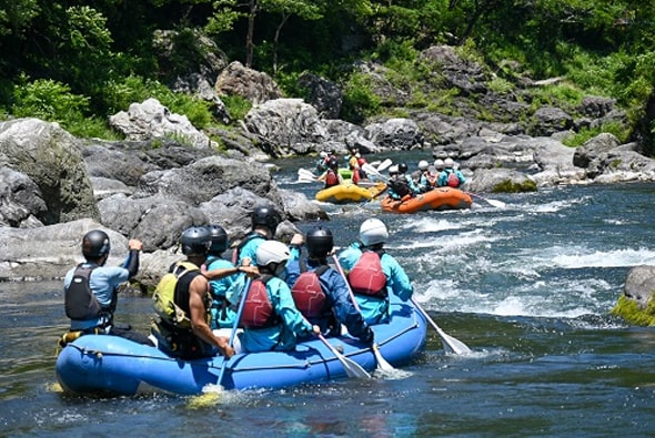 In the Tamagawa River Cleanup, each team rafts down the upper reaches of the Tamagawa River and exercises their bodies to the fullest in the rich natural environment. Along with rafting, they also pick up trash from the river, collecting about 10 kg of waste every year, including plastic, rubber, and pottery fragments.