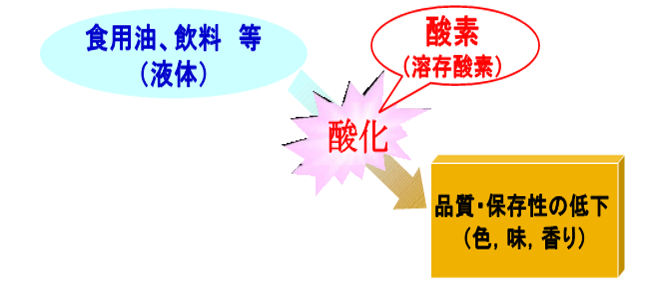 食品が酸素と触れて酸化が起こることで、その食品がもともと持つ「風味」や「品質」を変異させてしまい、これにより、品質低下=味の劣化や、保存期間の短縮が発生してしまいます。 対象の液体中から酸素を除去することで、酸化を防止するのが、当社の溶存酸素除去システムです。 ワインや食用油、水、石油および溶剤などで実績がございます。是非お問い合わせ下さい!