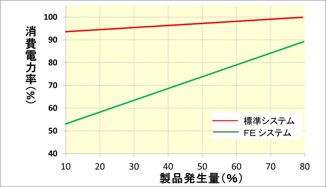 弊社の省エネPSAは、窒素ガス消費量の変動に応じて消費電力を削減できる弊社独自の制御システム(特許取得済み)です。 FEエネシステムは、インバータコンプレッサを用いずに窒素ガス消費量の変動に応じて、コンプレッサの消費電力を削減できる弊社独自の省エネ制御システムです(特許取得済み)。 RE・RT・Uシリーズにオプション機能として、搭載することが可能です。