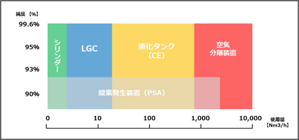 【酸素(O2)】「時間あたり酸素使用量(Nm/h)及び純度に応じた供給方法」