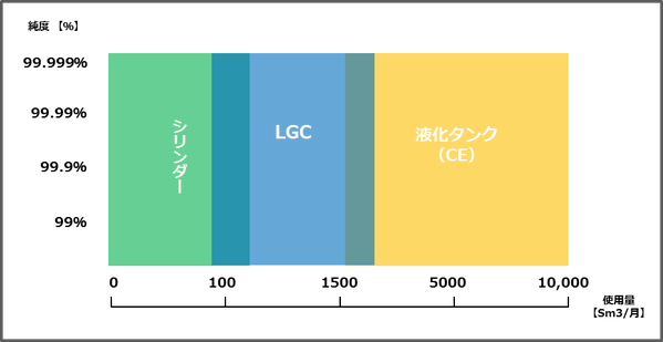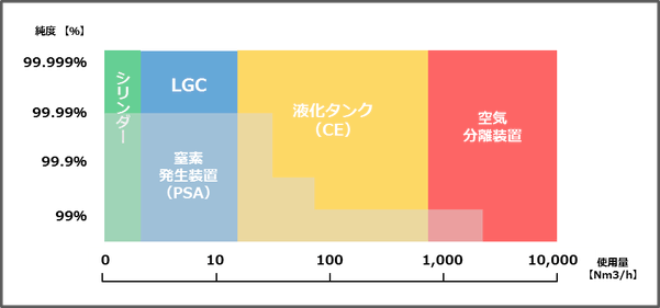 【窒素(N2)】「時間あたり窒素使用量(Nm/h)及び純度に応じた供給方法」