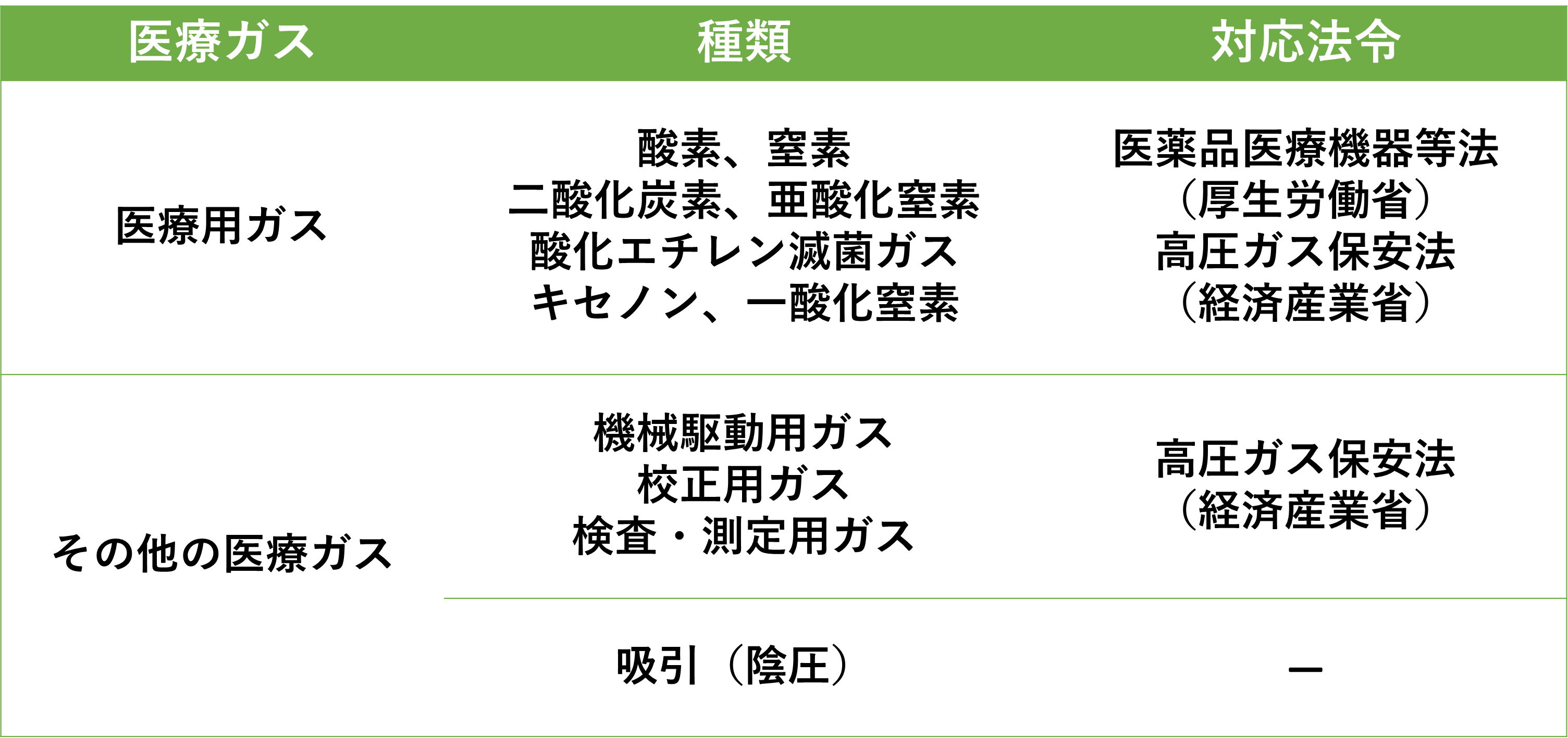 医療ガスは「医薬品、医療機器等の品質、有効性及び安全性の確保等に関する法律(以下、医薬品医療機器等法)」で“医薬品”として規定されたガス(医療用ガス)と、医薬品医療機器等法では医薬品として規定されてはいないものの、医療現場で利用されるガス(その他の医療ガス)に分けることができます。さらに、医療ガスの取り扱いは「高圧ガス保安法」で定められた手法に則って行わなければなりません。そのため医療ガスの取り扱いにおいては、両方の法律に精通した知見を持つことが必須となります。