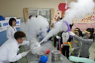 学校の授業ではできない液体窒素を用いた実験に生徒は興味津々。子供ならではの無邪気な反応があったり、鋭い質問も飛び交い、大変有意義な理科教室となりました。