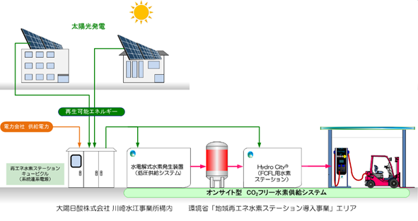川崎水江事業所内の社屋屋上に設置する太陽光パネルから得られた電力を利用し、水電解式水素発生装置にて発生させた水素ガスを、事業所内のFCFL動力源として使用いたします。