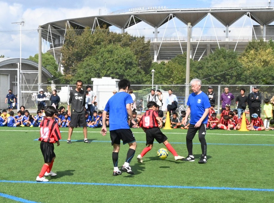 サッカークリニックは講師チームとの試合形式で実施しました。“どちらかのチームがゴールを決めるまで”というルールのもと、間近で見る講師陣のボールさばきに圧倒されつつも必死に応戦する小学生選手に歓声があがりました。その後は、参加チームがブロックに分かれて優勝を争うミニサッカー大会や、保護者や指導者の方々が豪華景品をかけて元プロのゴールキーパーに挑む PKアトラクションも行われました。