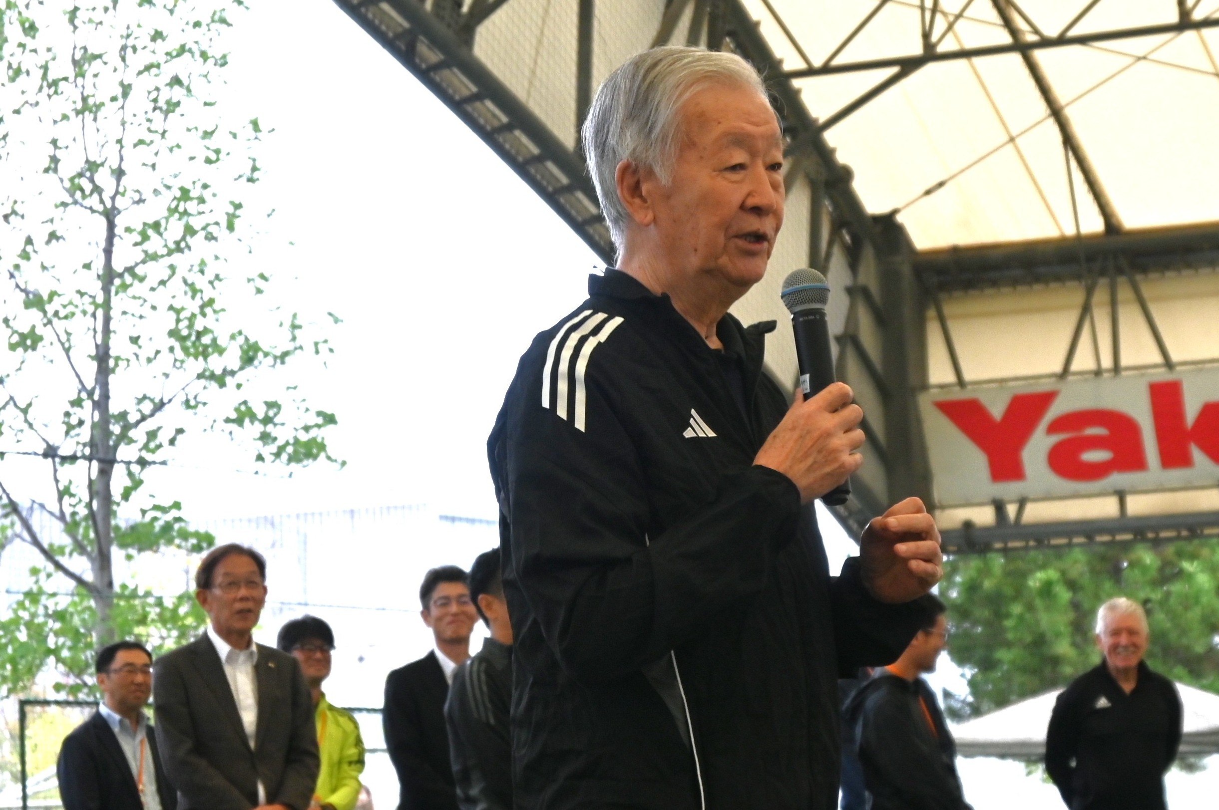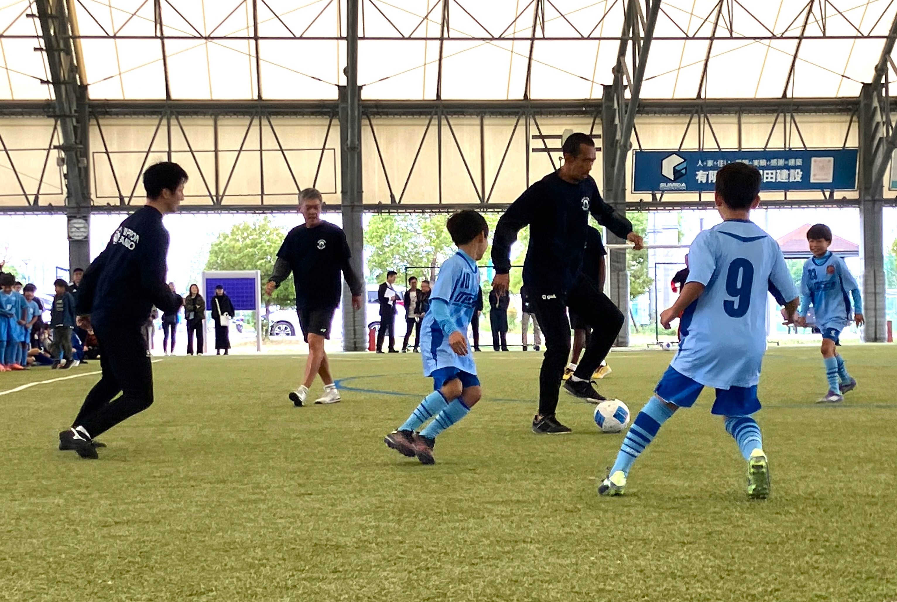 左より、大陽日酸 梅原広報部長、 大阪府サッカー協会 梶川副会長、大陽日酸 千葉関西支社長、高田竜也氏(講師アシスタント)、 本田泰人氏、セルジオ越後氏、久保竜彦氏、ジョージ・トレド氏、長尾光弘氏(講師アシスタント)広山晴士氏、 アデマール・マリーニョ氏、大陽日酸 小出コーポレートユニット長