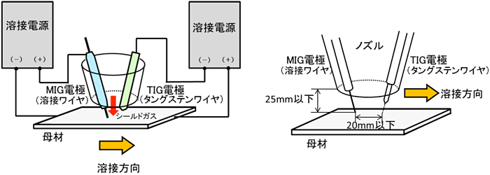 - また、二つのアークの間隔を20mm以下と接近して発生させることで、アークの安定性を高めています。TIGとMIGとの二つのアークを最適配置することで、溶接速度を増大させることが可能です。