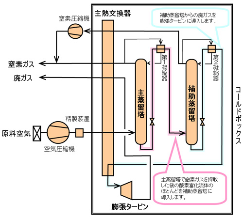 本窒素製造装置は、主蒸留塔の下流に、主蒸留塔で窒素ガスを採取した後の酸素富化流体(原料空気より窒素成分は減少)をさらに蒸留するための補助蒸留塔を設置した2塔式窒素製造装置です。