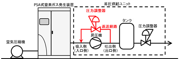 本発明では、PSA式窒素ガス発生装置の後段に昇圧機を置き、昇圧機の吐出側から吸入側へガスを送る返送経路とその返送経路に圧力調整器を設けることで、吸入側の圧力が低下した場合に、一度昇圧された吐出側のガスを吸入側に戻すことができるようにしています。