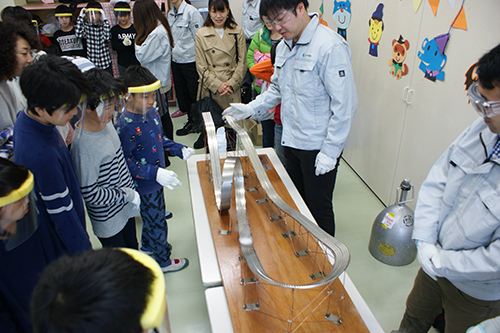 当社では、液体窒素を利用した実験を通じて、子どもたちに「科学を身近に感じてもらうこと」を目的に「日本酸素キッズ理科教室」を開催しています。この教室は、子どもたち一人ひとりが液体窒素でバラの花を凍らせるなど、実際に体験してもらうのが特徴です。