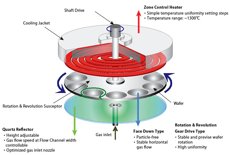 The BMC301 is a mass production MOCVD system for GaAs/InP, aimed at applications such as high-speed communication device and laser diode (LD).